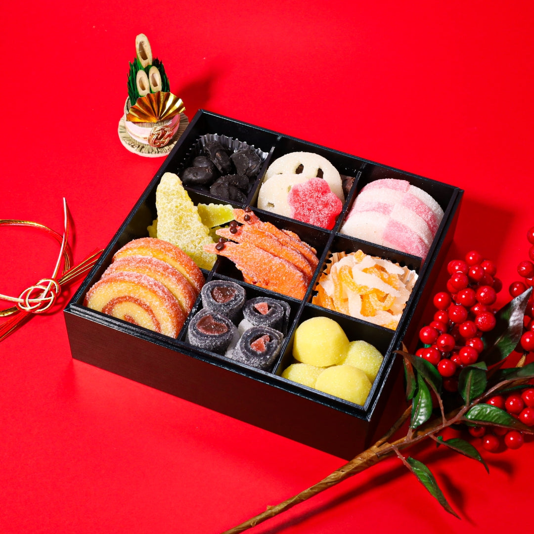 おせちでは定番の伊達巻きや昆布巻きや栗きんとんの形をしたグミなどが並ぶスイーツおせちです。